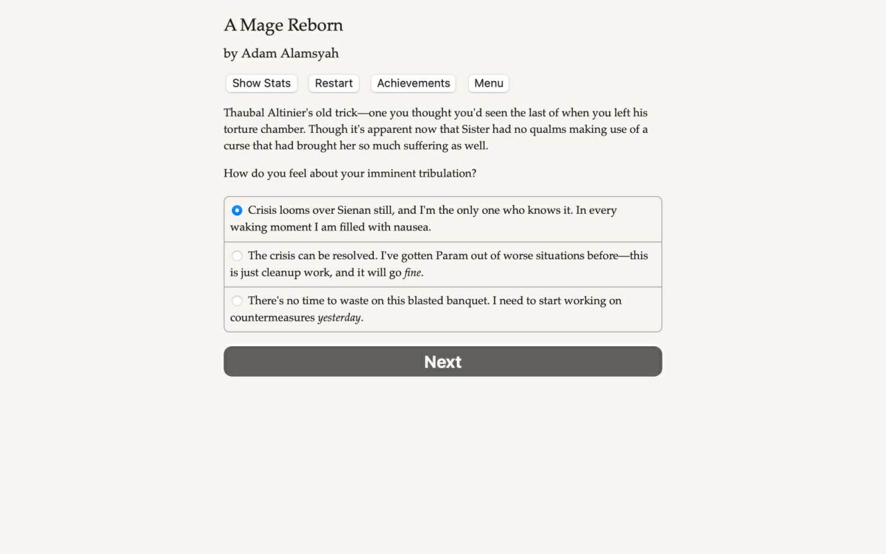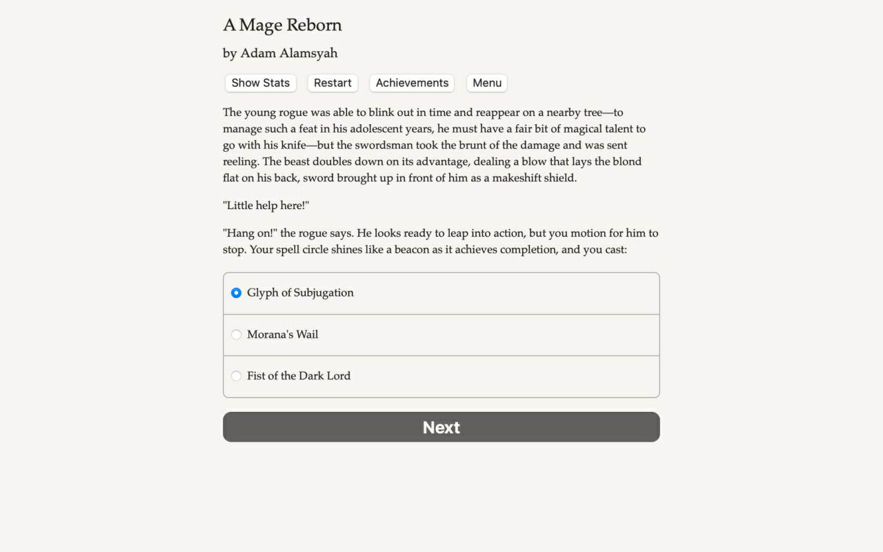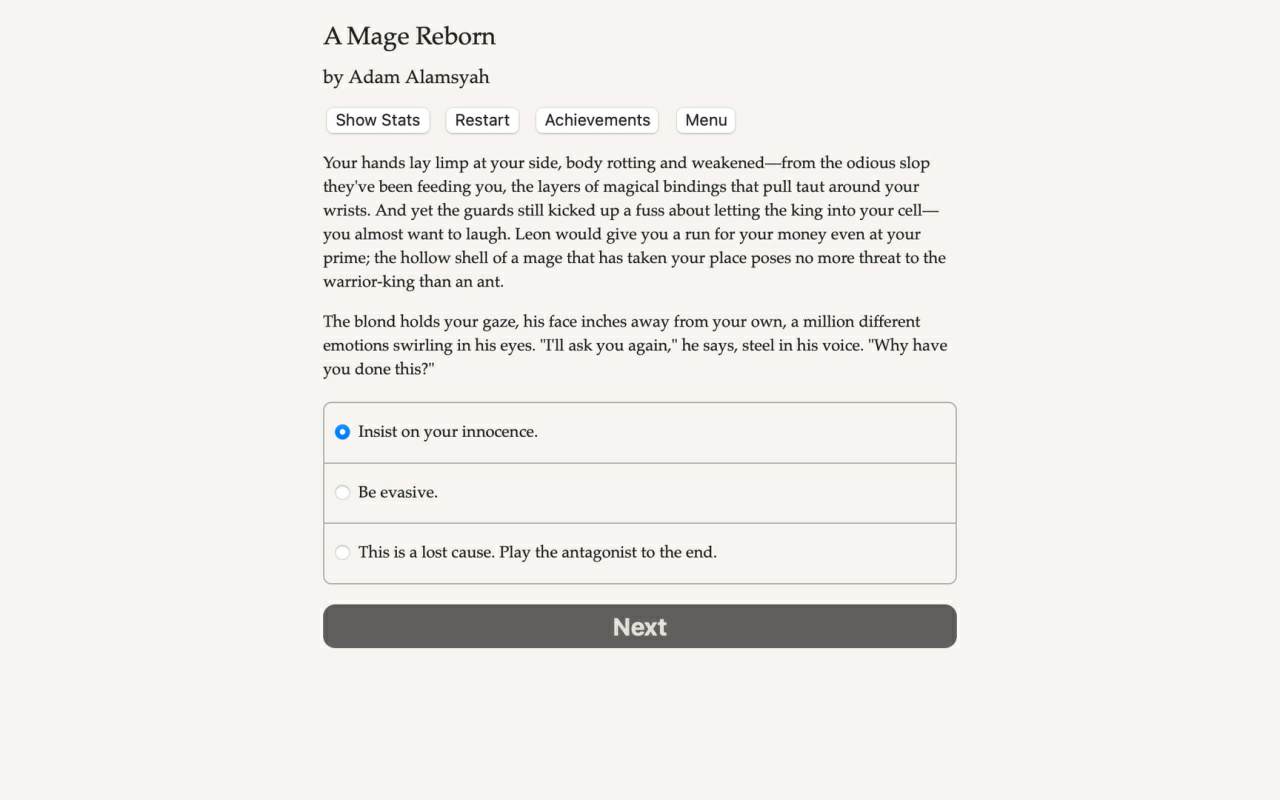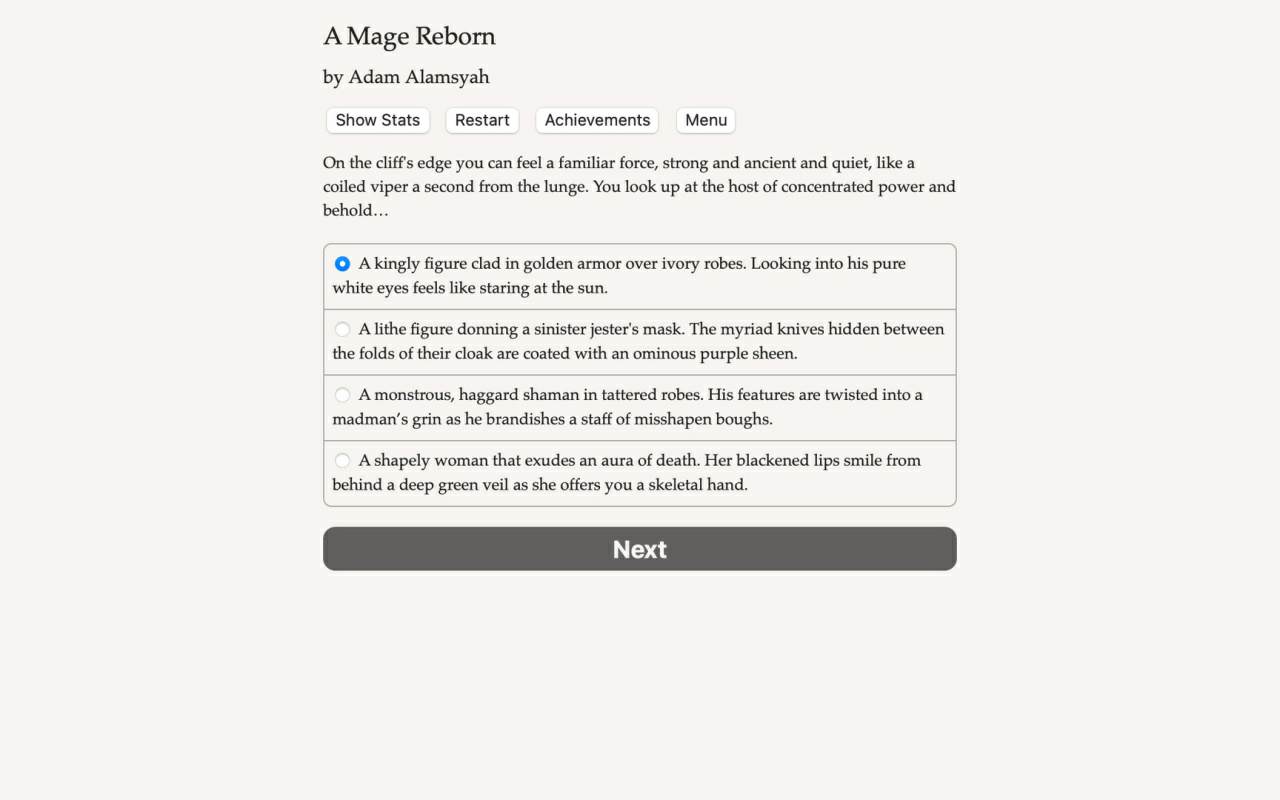 Необычное интерактивное ролевое путешествие, в котором бремя власти и ответственности будет возложено на плечи одного одаренного чародея. Вся текстовая основа повествования максимально задействует фантазию, что позволит вам самостоятельно определять вектор развития личности через прощение давних обид или совершение жестокой мести.