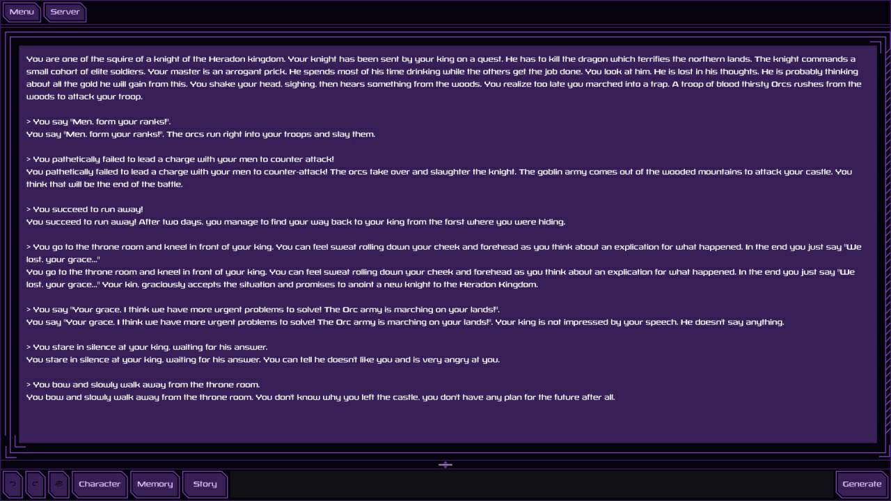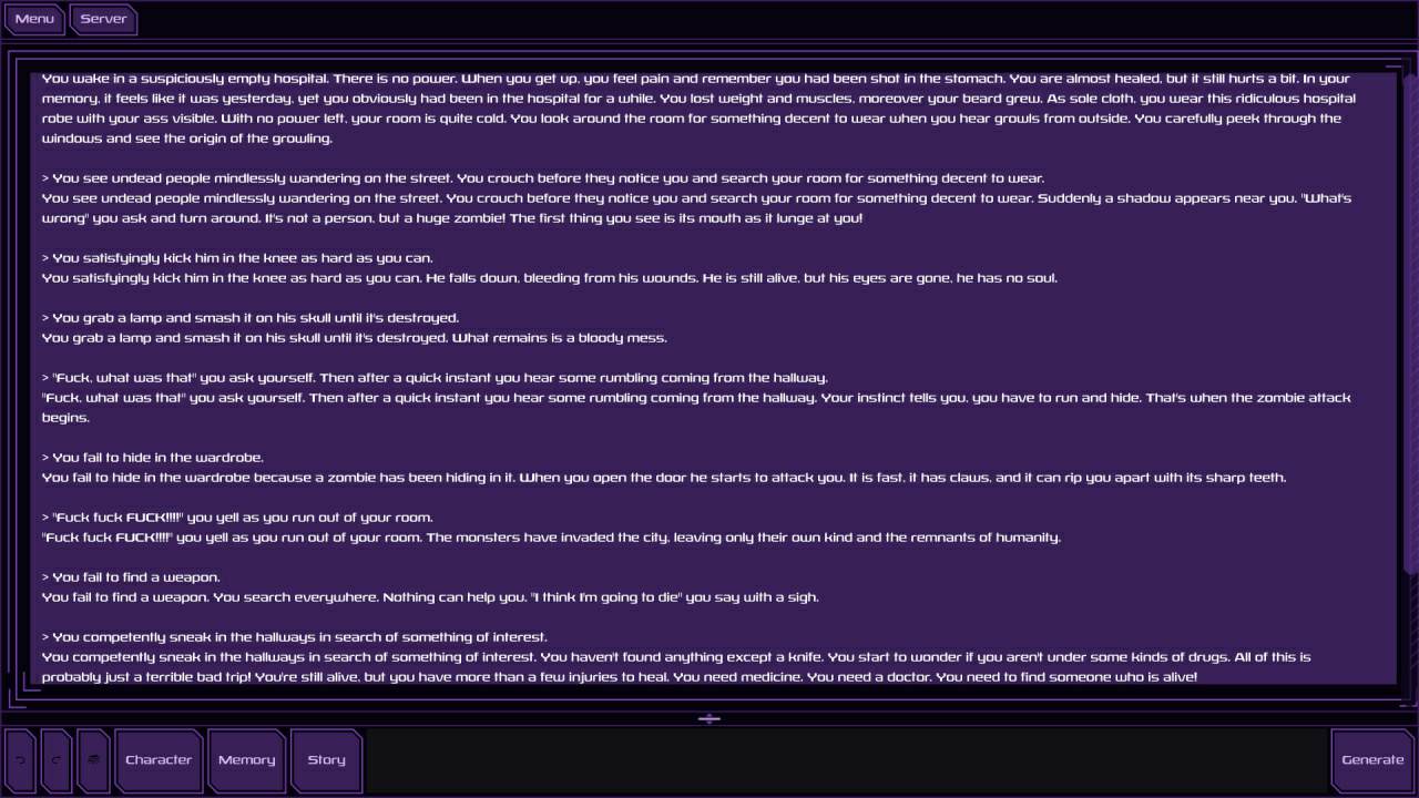 Необычное текстовое приключение, в котором роль ведущего и рассказчика была доверена искусственному интеллекту. Игра предлагает вам с головой погрузиться в самые разнообразные безграничные истории, в котором единственным пределом выступает воображение самого автора.