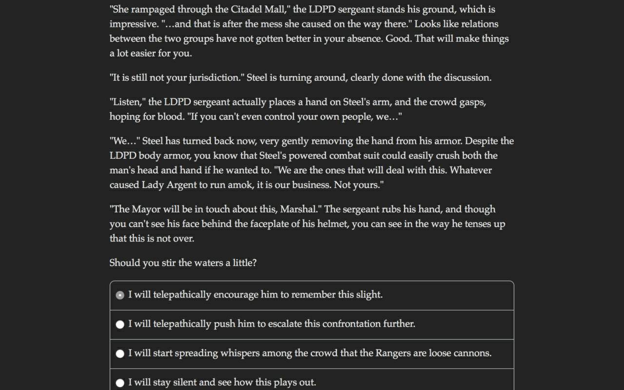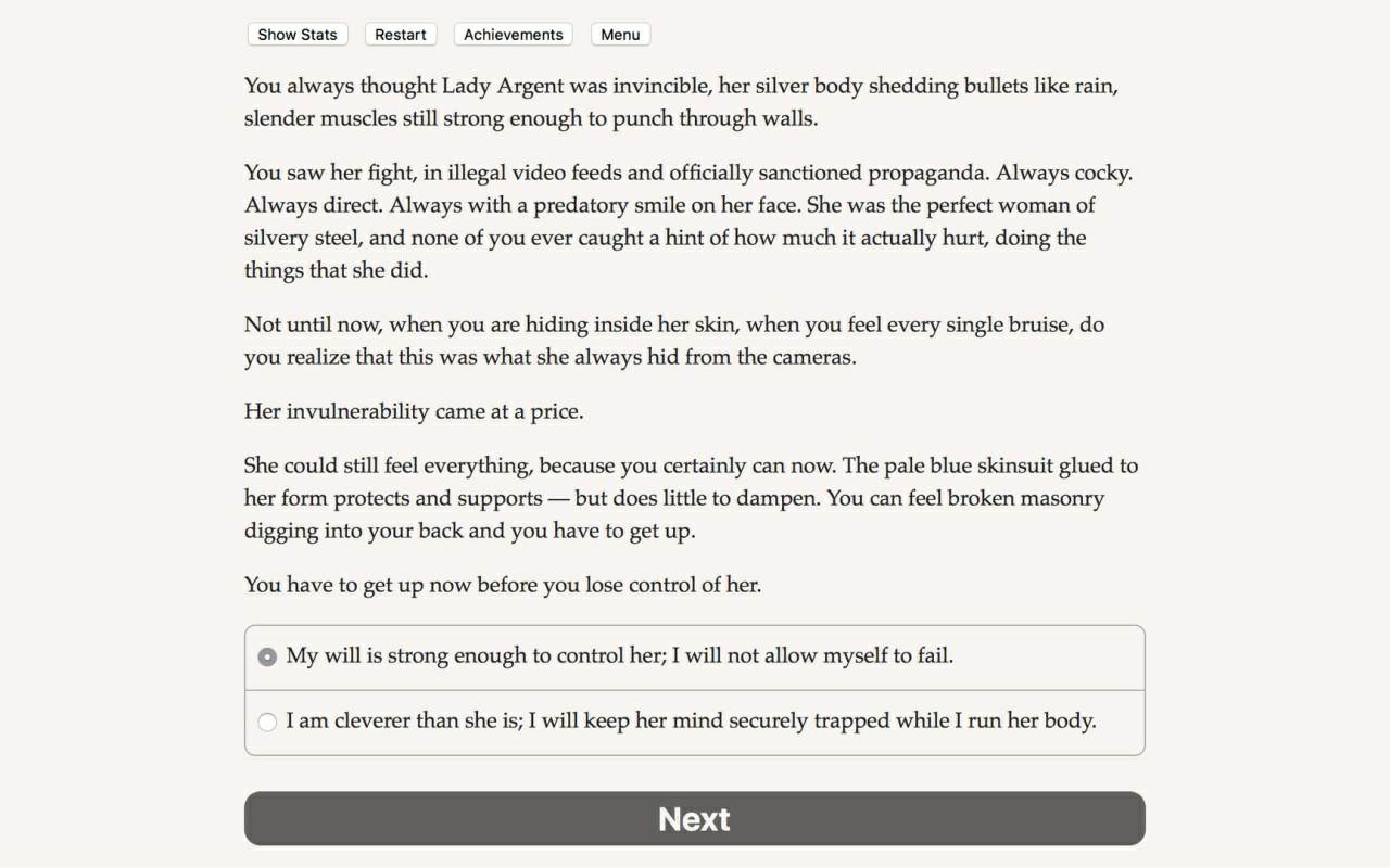 Атмосферный текстовый проект, в котором всё полагается на воображение игрока во время управления могущественным телепатом. Вы сможете погрузиться в потусторонние разумы, что позволит вам взять под свой контроль физические оболочки жертв. Геймплей требует жонглирования 3 независимыми личностями.