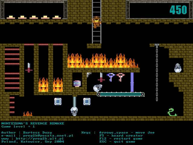 Montezuma's Revenge Remake - своеобразный ремейк некогда популярного хита, который появился на свет еще в далеком 1984 году и получил достаточно широкую известность на классических 8-битных платформах, начиная от Atari 5200, ZX Spectrum, Sega Master System и Apple II, заканчичая - IBM PC. В роли неизвестного авантюриста, приготовьтесь в очередной раз отправиться на поиски заветных сокровищ, которые находятся на просторах десятков закрученных лабиринтов. Совершите путешествие через множество захватывающих этапов, примите участие в решении головоломок и вернитесь домой с обещанным кладом. Все в лучших традициях оригинальной игры! Несмотря на достаточно примитивную (а по нашим меркам и вовсе "вырвиглазную") графику - настоятельно рекомендуется всем почитателям старинных платформеров.