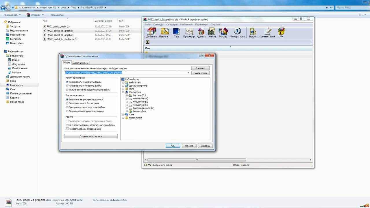 2) Распаковать содержимое FM22_pack1_main.1.zip, FM22_pack2_2d_graphics.zip, FM22_pack3_3d_graphics.zip, FM22_pack4_3d_stadiums.zip в одну папку. (Можно использовать "Распаковать здесь", оно по умолчанию распакуется в одну папку)