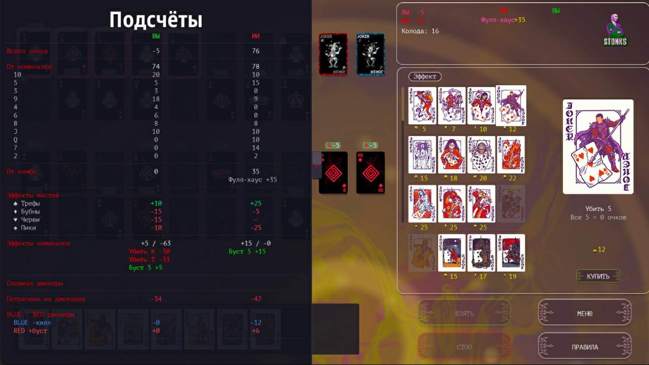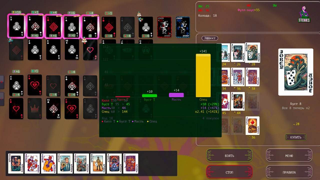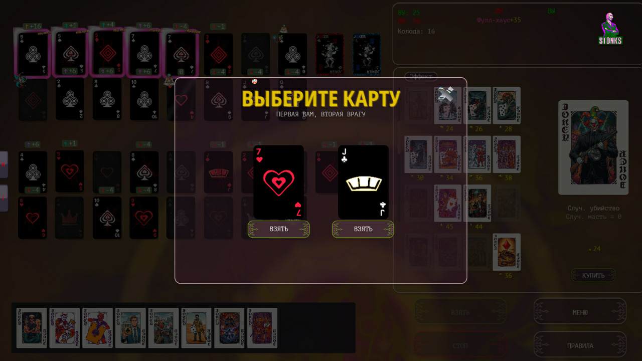 Вас ждёт большое и очень интересное тактическое противостояние, созданное на основе покерных комбинаций, в котором фундаментальные правила классической карточной дуэли оказались подвержены хаотичному влиянию конкретных модификаторов. Игровой процесс базируется на абсолютной прозрачности данных.