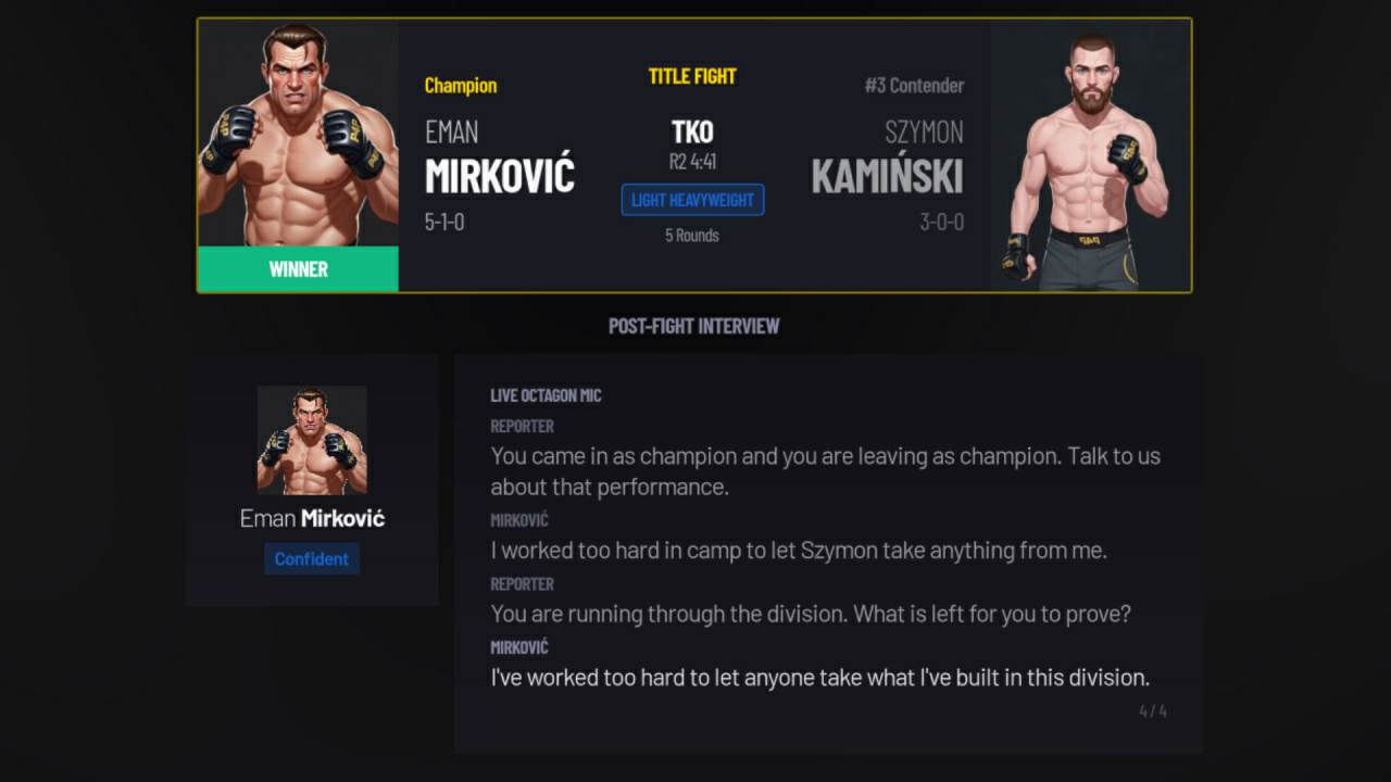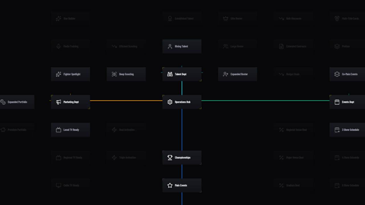 Игра представляет из себя этакий симулятор управления смешанными единоборствами, в котором вы будете должны превратить простое скромное региональное шоу в полноценную мировую империю. Всё окружение поостоянно будет трансформироваться из-за влияния ваших конкурентов, стремящихся перехватить перспективных атлетов и занять лучшие даты в календаре событий.